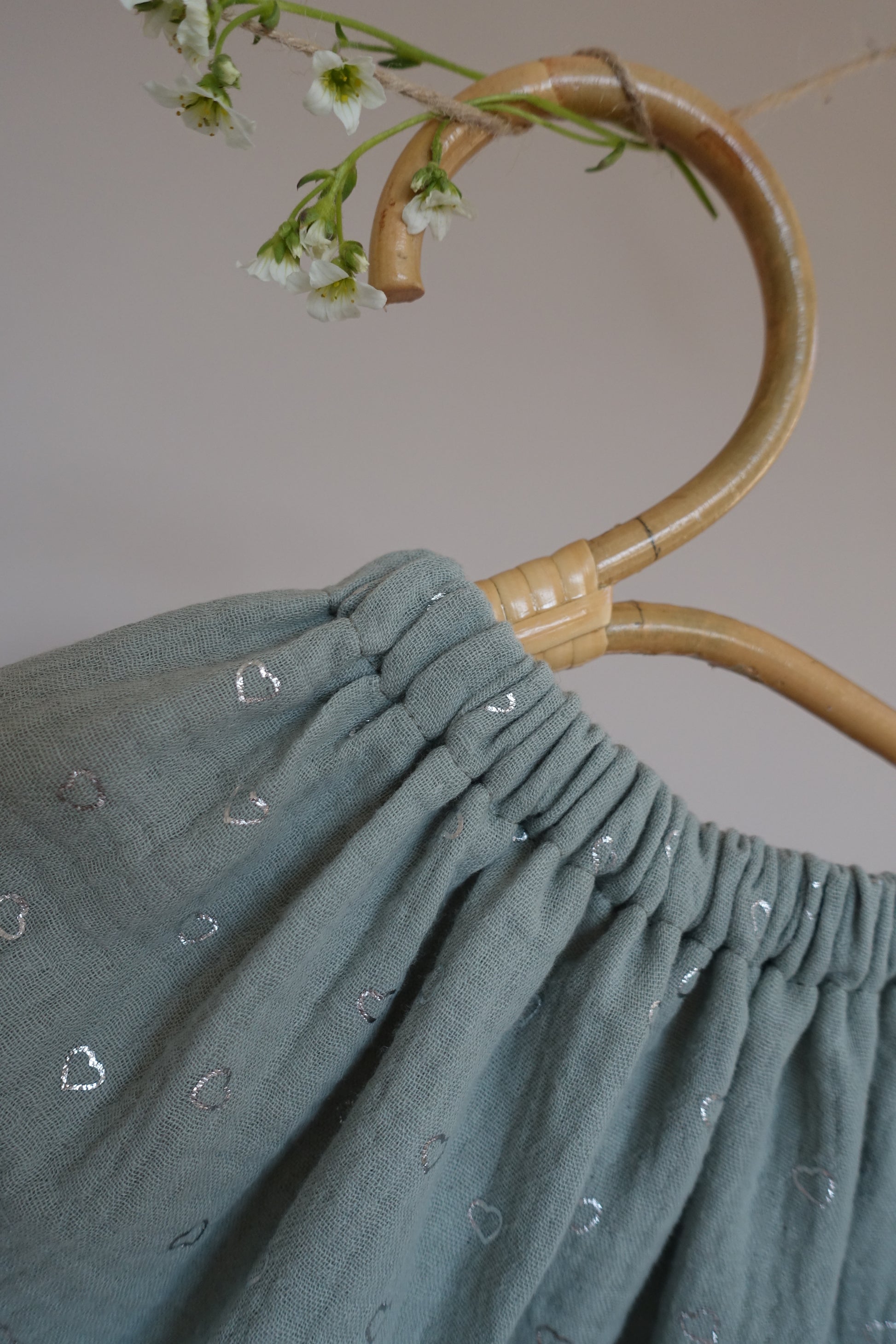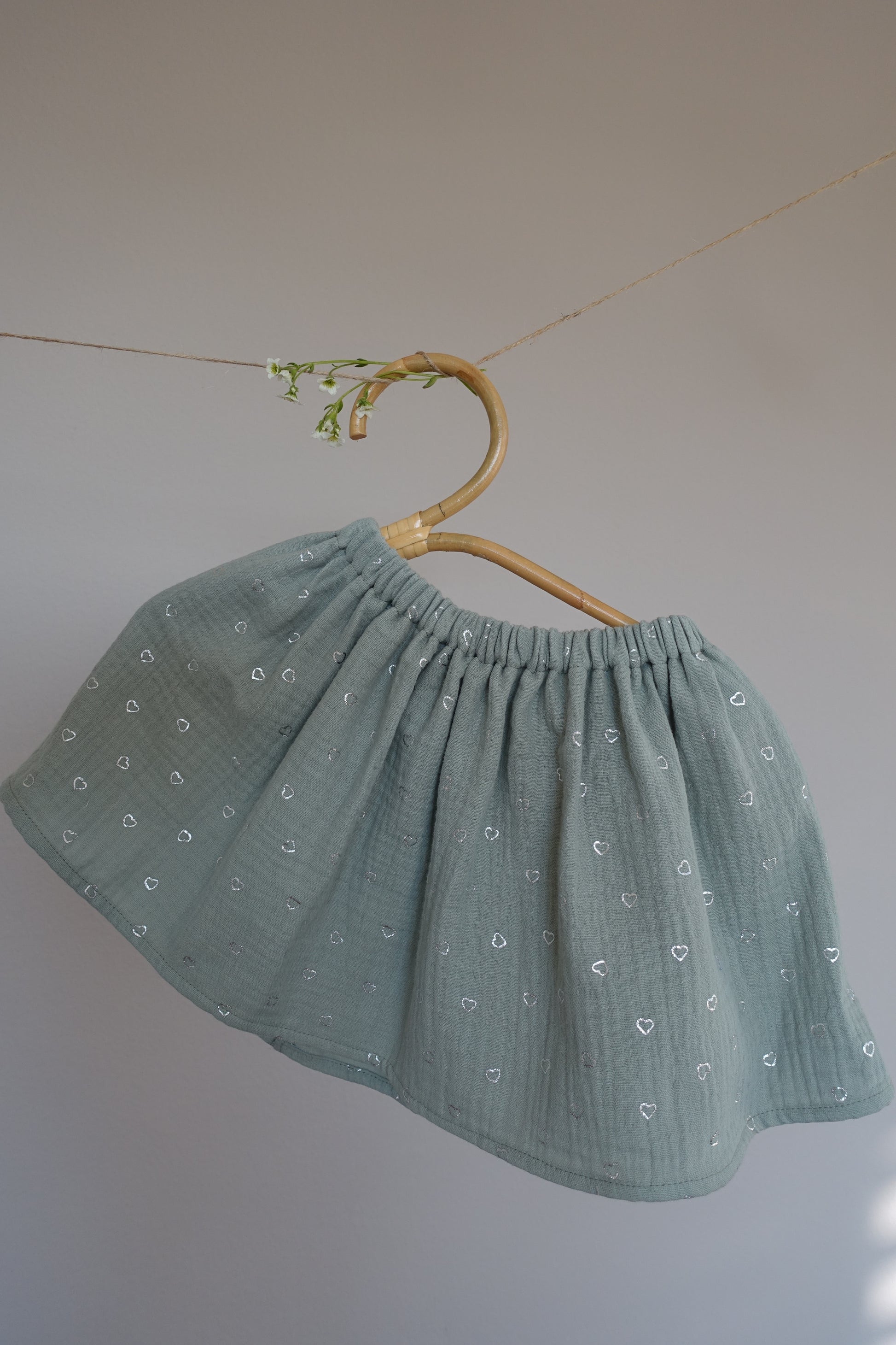 So leicht wie der Frühling und so besonders wie kleine Herzensmomente: Unser Waldknopf Musselinrock in zartem Grün bezaubert mit feinen, silbernen Herzen, die je nach Lichteinfall dezent schimmern. Aus weichem, atmungsaktivem Baumwoll-Musselin gefertigt, bietet er höchsten Tragekomfort – luftig, sanft zur Haut und ideal für warme Tage.