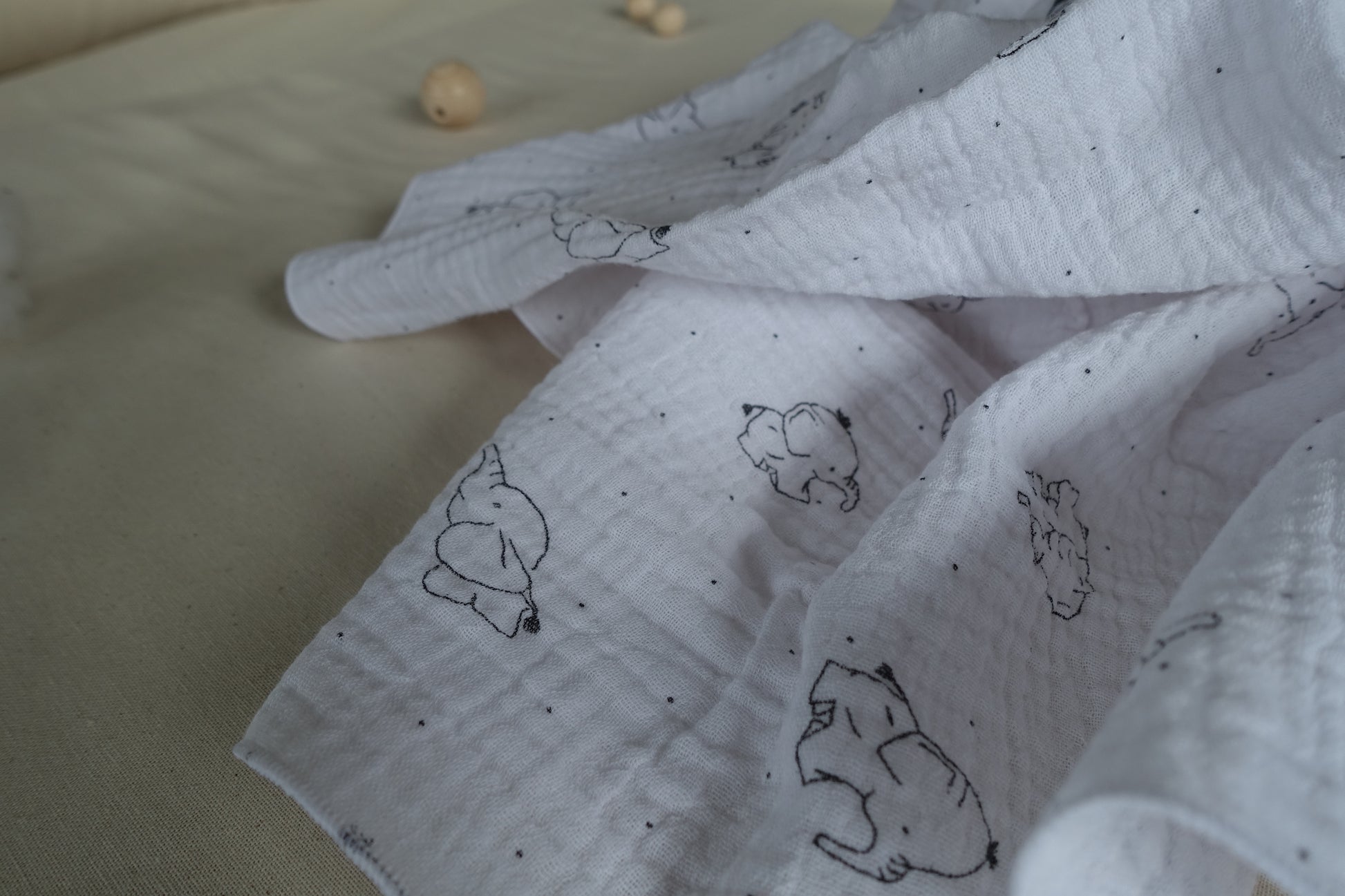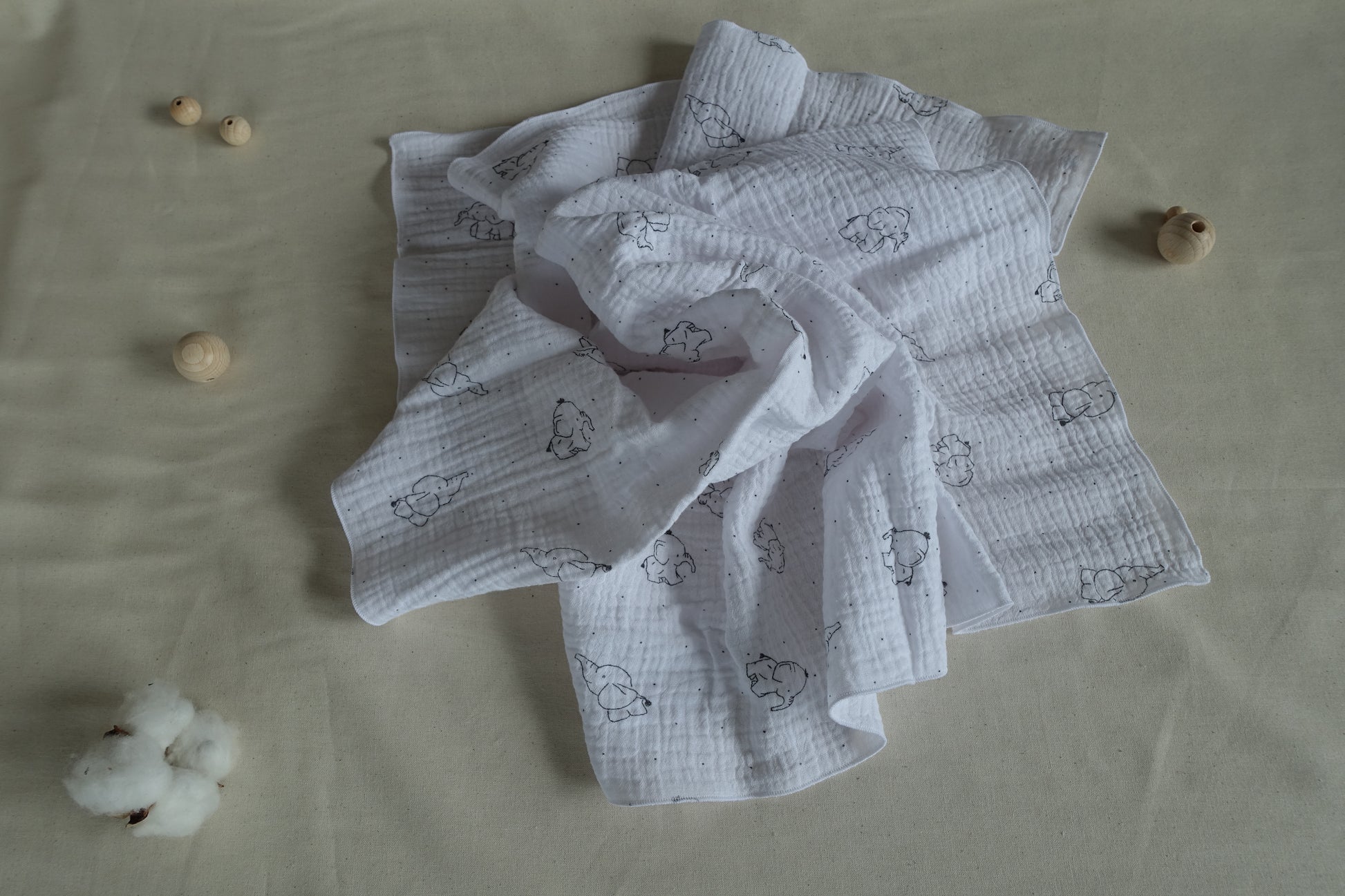 Waschbar bei 30 Grad im Schonwaschgang. Nach dem Waschen glatt ziehen und zum Trocknen aufhängen oder für mehr Kuschelfaktor in den Trockner geben. Musselin darf knittern – das macht seinen Charme aus.