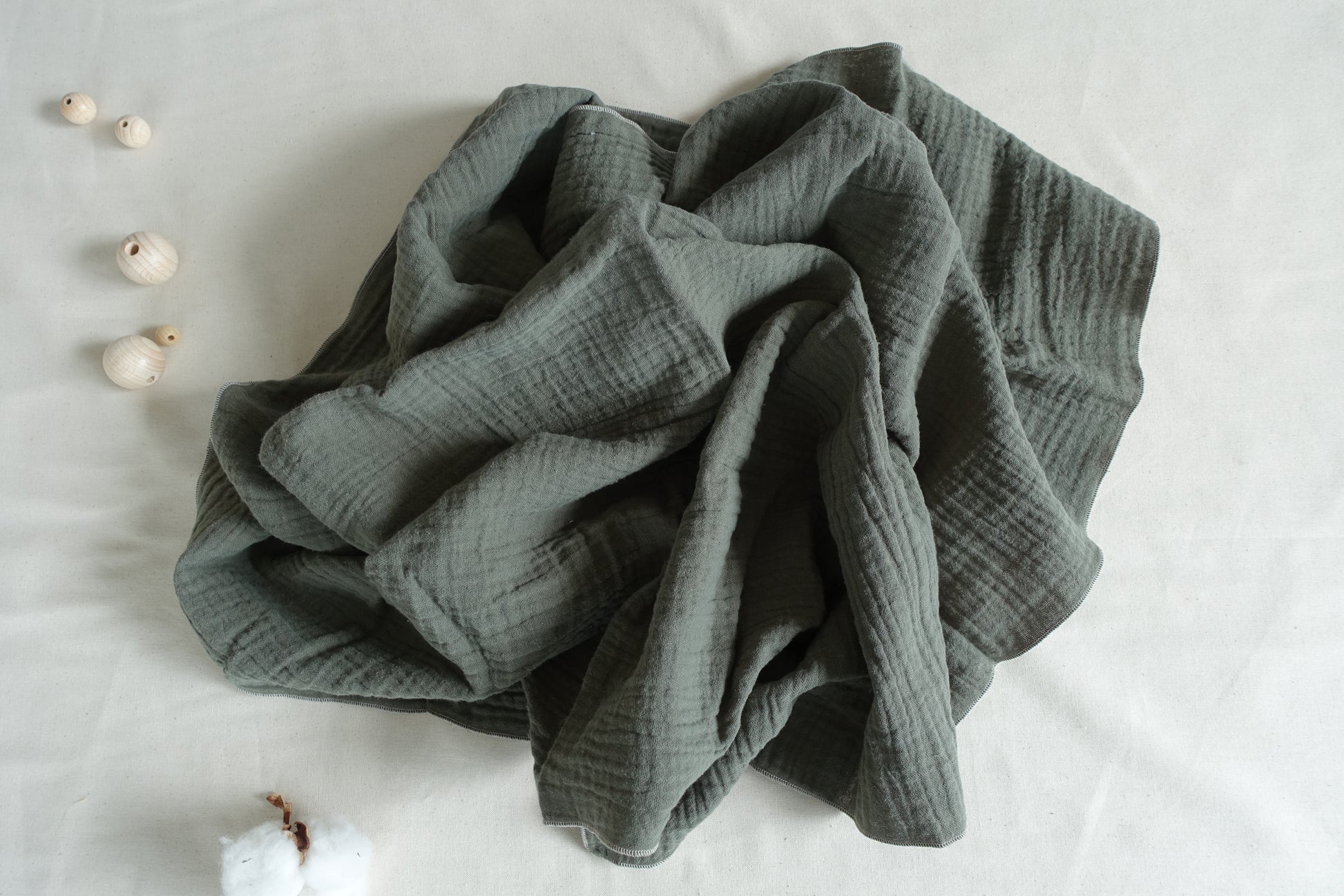 Pflegehinweise: Waschbar bei 30 Grad im Schonwaschgang. Nach dem Waschen glatt ziehen und zum Trocknen aufhängen – im Trockner wird es besonders weich und bekommt seine charakteristische Struktur. Musselin darf knittern – das macht seinen Charme aus.